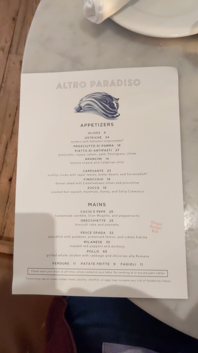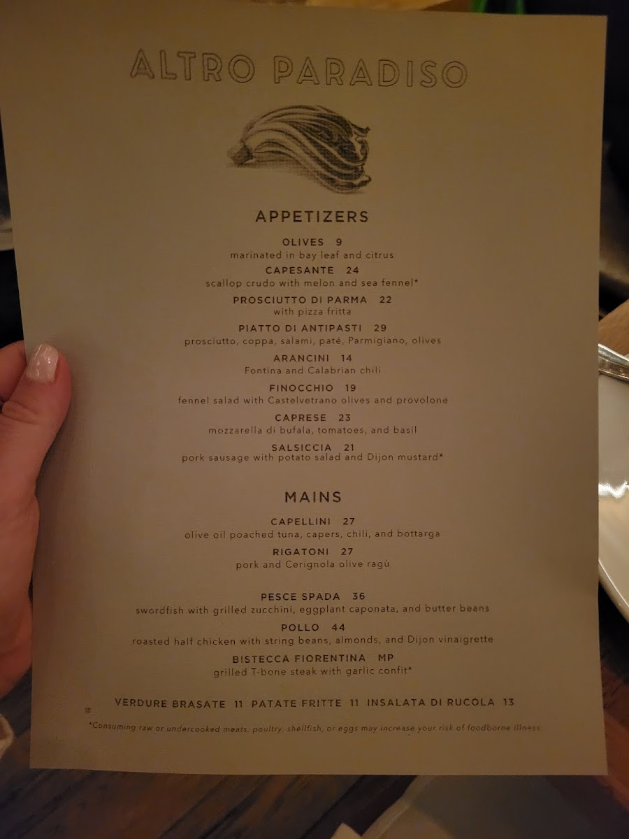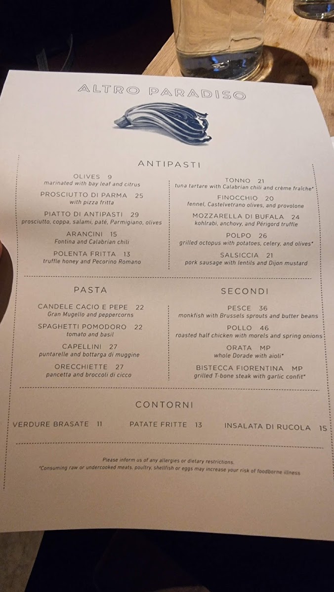 As you step into Altro Paradiso, you are greeted by a warm, vibrant ambiance that invites you to relax and savor every moment. The décor beautifully balances modern chic with rustic charm, creating a space that feels both intimate and lively. The friendly and attentive staff, including knowledgeable sommeliers and gracious waitstaff, elevate your dining experience to new heights.